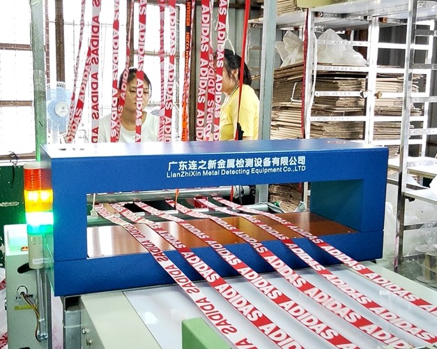新某利紡織廠專業(yè)生產(chǎn)滴膠絲印織帶,因客戶品質(zhì)要求加裝連之新金屬檢測(cè)機(jī)探頭于現(xiàn)有生產(chǎn)線,可一次性檢測(cè)多條織帶,如有需要可控制停機(jī)。